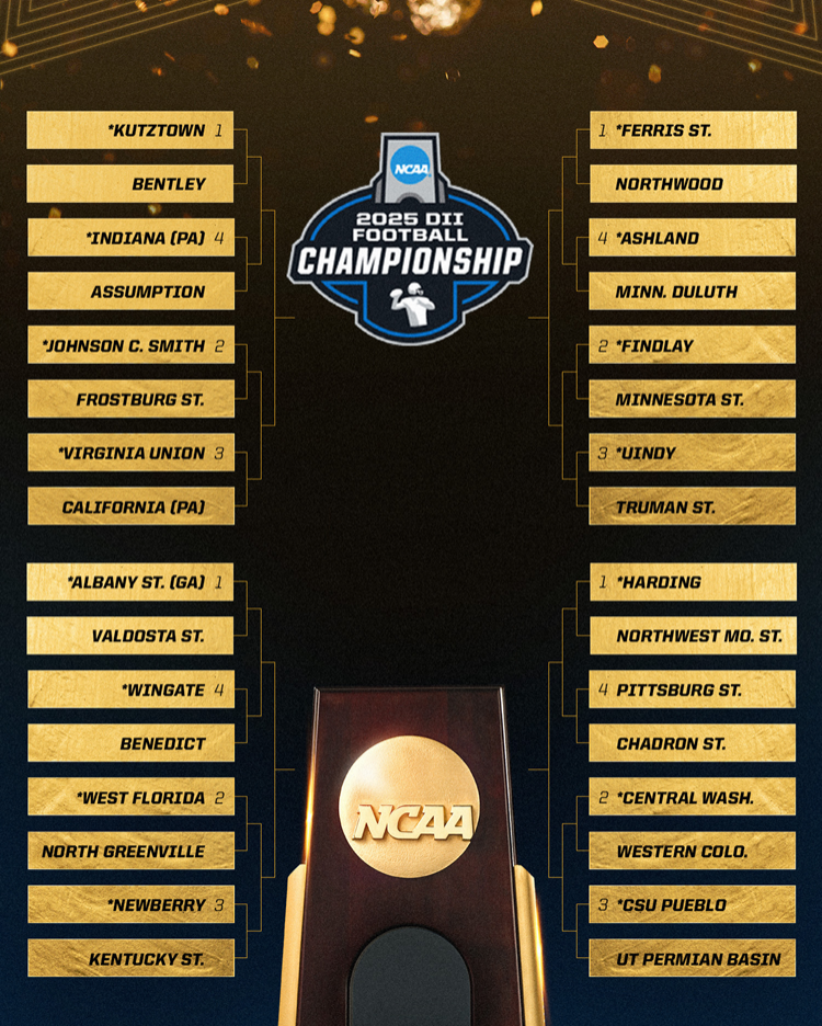 The playoff field for the 2025 Division II Football Championship was announced on Sunday, Nov. 16. The firs time ever, the field includes automatic qualifiers from each of the 16 conferences in Divisoin II. Defending national champion Ferris State enters the post-season as a No. 1 seed in Super Region Three. The Bulldogs are undefeated this season and have not lost a game since week zero, 2024. The other top seeds are Kutztown (SR1), Albany State (SR2) and Harding (SR4)The playoffs will begin this coming Saturday, Nov. 22.