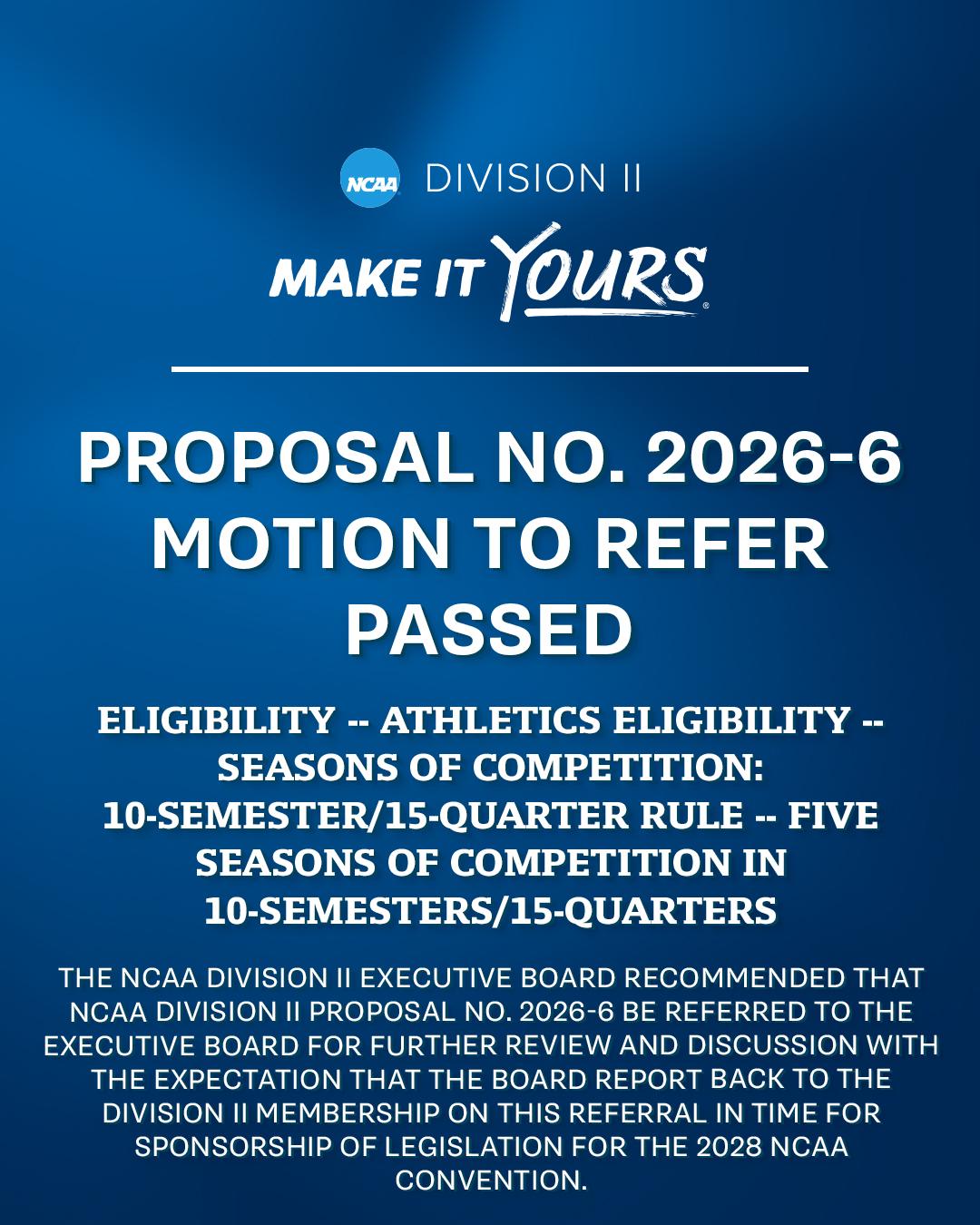 "The NCAA Division II Executive Board recommended that NCAA Division II Proposal No. 2026-6 be referred to the executive board for further review and discussion with the expectation that the board report back to Division II membership on this referall in time for sponsorship of legislation for the 2028 NCAA conventiton."